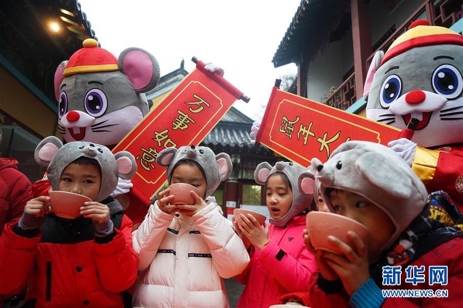 1月2日,小朋友在南京玄奘寺的赠粥送祝福活动现场喝腊八粥。 当日是农历腊月初八,中国传统腊八节。 新华社记者 季春鹏 摄