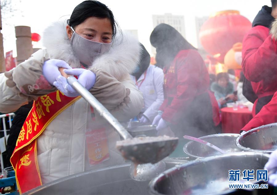 1月2日,工作人员在青海省海东市平安区“共品腊八粥”活动现场为市民盛粥。 当日是农历腊月初八,中国传统腊八节。 新华社记者 张龙 摄