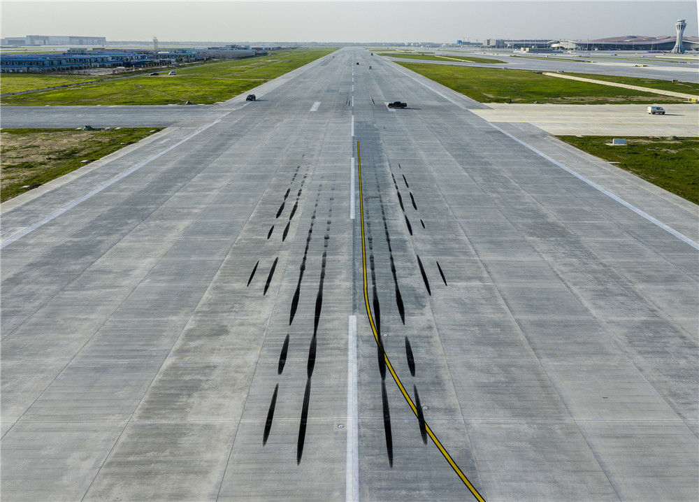 2019年5月29日,北京大兴国际机场,飞机在跑道上留下的痕迹。马文晓/视觉中国