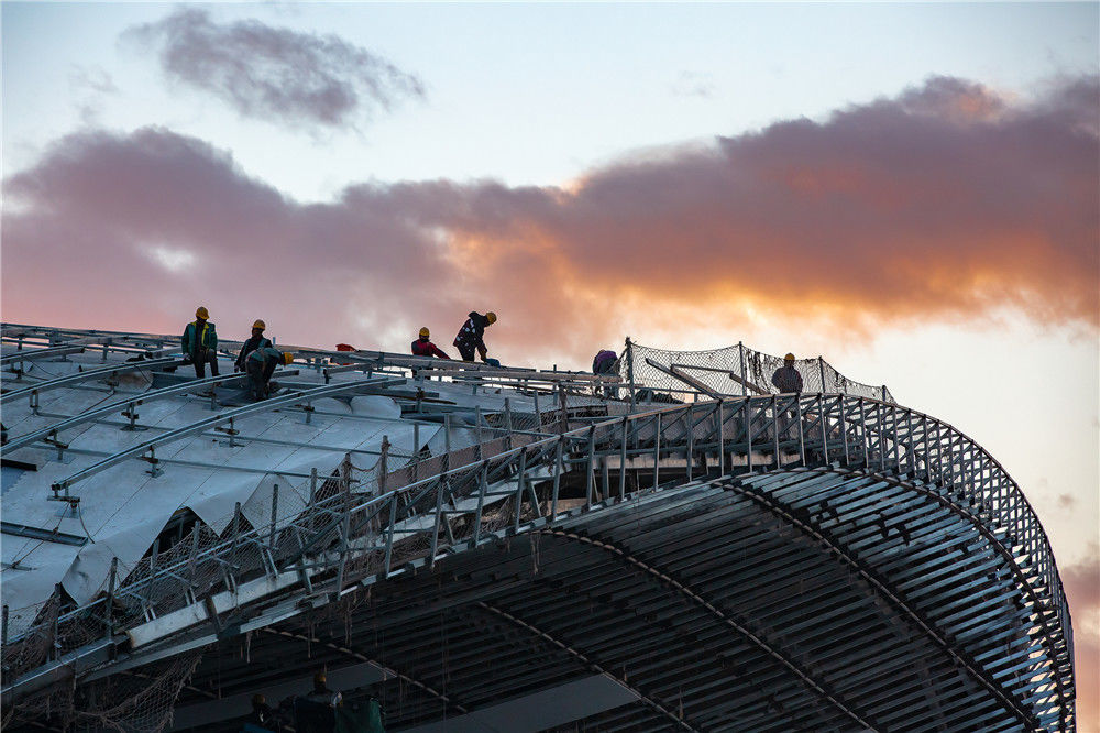 2019年1月13日,北京大兴机场航站楼顶部最中央,一个工人正在进行验收工作。陈国亨/视觉中国
