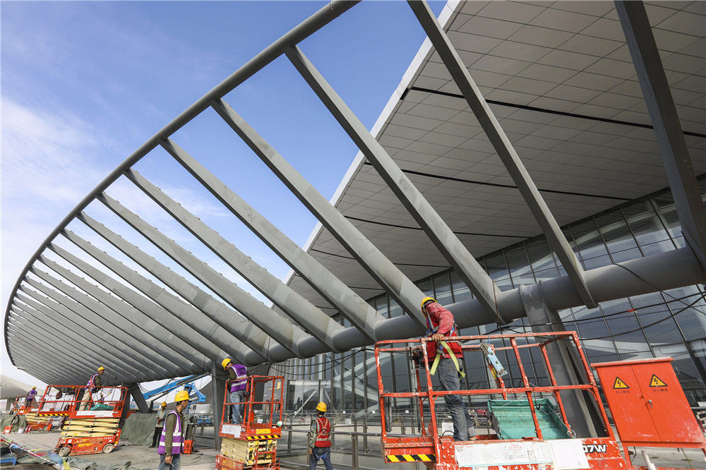 2019年5月13日,北京大兴国际机场进行真机试飞。工人正在工作。可为/视觉中国
