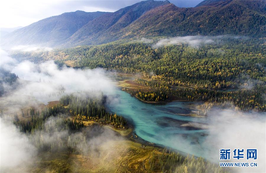 9月24日无人机拍摄的喀纳斯景区风光。新华社记者王菲摄