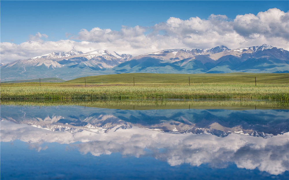 2019年7月11日,新疆巴音郭楞独库公路边的天山倒影。黄光浩/视觉中国