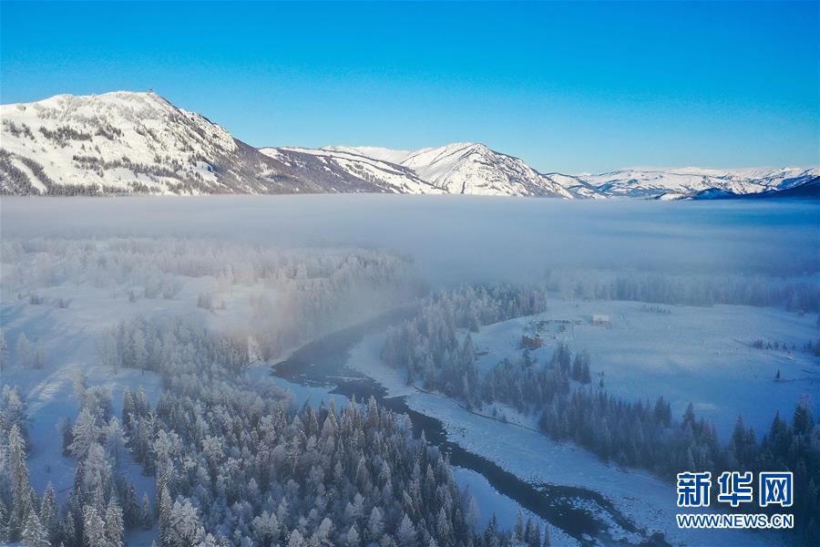 这是1月3日拍摄的晨雾下的喀纳斯河(无人机照片)。新华社记者宋彦桦摄