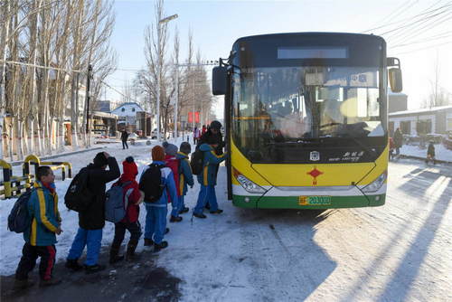 2019年12月18日,在新疆伊犁哈萨克自治州察布查尔锡伯自治县海努克乡阿热吾斯塘村小学,学生排队登上“校车专线”。新华社记者丁磊摄