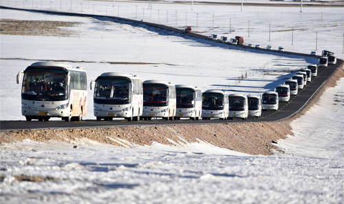 2019年12月23日拍摄的西藏那曲市双湖县牧民的迁徙车队。西藏那曲市双湖县嘎措乡、措折羌玛乡、雅曲乡共2900人,告别了平均海拔5000米的家乡,经过近千公里搬迁到海拔相对较低的藏南雅鲁藏布江南岸的贡嘎县境内。这是西藏自治区近年来实施的极高海拔生态搬迁项目之一,双湖县三个乡的整体搬迁是其中人数最多、跨度最远的一次搬迁。新华社记者觉果摄