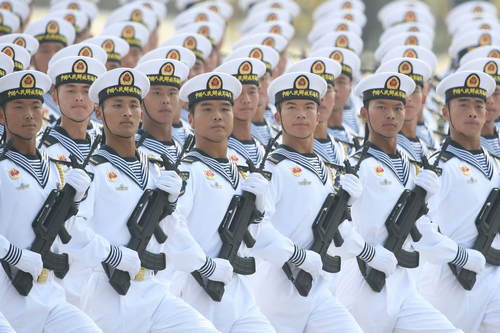 2019年10月1日,庆祝中华人民共和国成立70周年大会在北京天安门广场隆重举行。这是海军方队接受检阅。新华社记者刘大伟摄