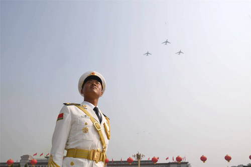 2019年10月1日,庆祝中华人民共和国成立70周年大会在北京天安门广场隆重举行。这是空中梯队飞过天安门上空。新华社记者金良快摄
