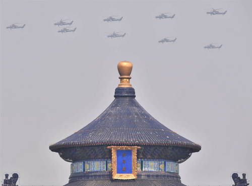 2019年10月1日,庆祝中华人民共和国成立70周年大会在北京天安门广场隆重举行。这是从天坛公园拍摄的陆航突击梯队。新华社记者贺长山摄