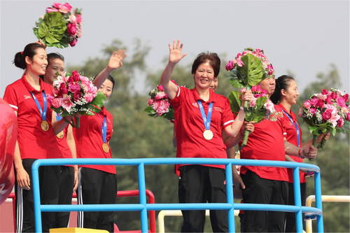 2019年10月1日,庆祝中华人民共和国成立70周年大会在北京天安门广场隆重举行。这是中国女排亮相“祖国万岁”彩车。新华社记者欧东衢摄