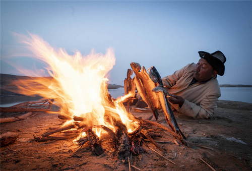 2019年4月11日,在新疆尉犁县罗布人村寨里,罗布人阿木东·艾不东在塔里木河畔烤鱼。新华社记者赵戈摄