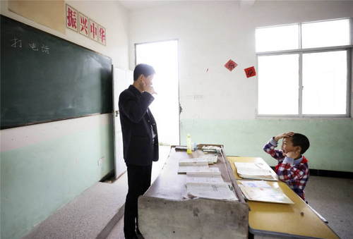 2019年5月8日,王北海(左)在教室内为陈威宇讲解“打电话”的流程。江西省瑞金市大柏地乡三河小学坐落于大山深处,老师王北海陪伴着他唯一的学生陈威宇。新华社记者兰红光摄