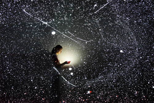 2019年5月28日, 参观者在贵州省贵阳市举办的2019中国国际大数据产业博览会“追梦·未来”数字艺术特展上观看和体验艺术作品《宇宙深空》。新华社记者杨文斌摄