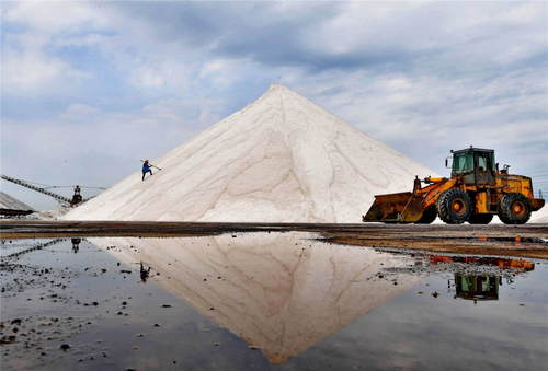 2019年7月3日,河北唐山海港经济开发区大清河盐场的工人在洗盐场工作。新华社记者杨世尧摄