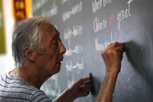2019年7月30日,叶连平在“留守未成年人之家”教室里为第二天的英语课准备板书。暑期伊始,在安徽省和县乌江镇卜陈村“留守未成年人之家”,92岁的退休教师叶连平又开始了暑假的忙碌。新华社发(黄博涵 摄)