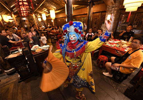 2019年8月4日,食客在四川省成都市宽窄巷子景区内的一家火锅店观看“变脸”表演。新华社记者刘坤摄