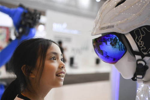 2019年8月25日,一名小朋友在2019智博会主会场重庆国际博览中心参观。新华社记者王全超摄