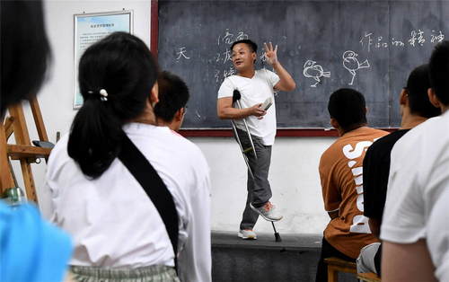 2019年9月9日,在位于西安市的陕西省城市经济学校,计算机平面设计专业的美术老师王旭阳在给新生讲授绘画基础知识。该校是西安唯一一所针对残障人士设立的特殊教育中等职业学校。新华社记者刘潇摄