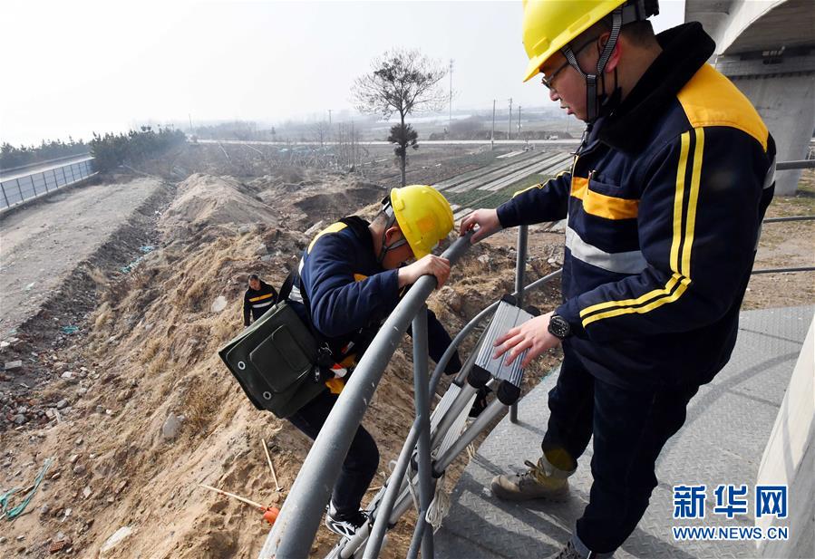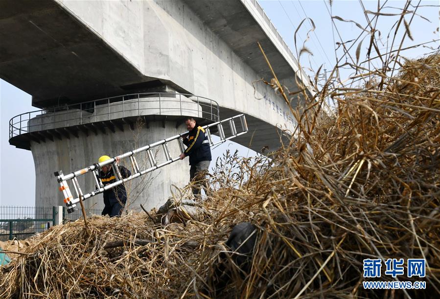 1月3日,中国铁路济南局临沂工务段工程技术员准备对沂河特大桥桥墩进行检查。新华社记者 朱峥摄