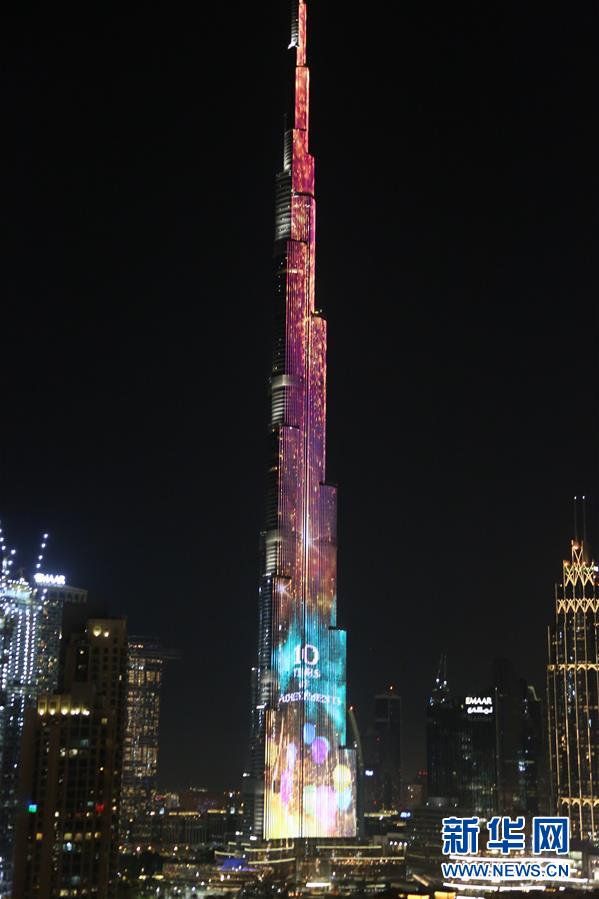 这是1月4日在阿联酋迪拜拍摄的世界第一高楼哈利法塔庆祝开放10周年灯光秀。新华社记者苏小坡摄