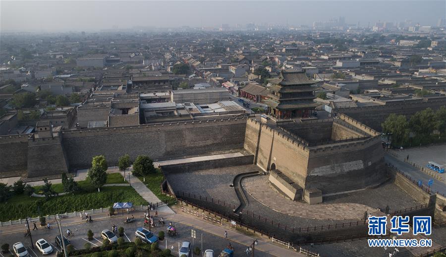 这是7月20日无人机从南门拍摄的平遥古城全景。鸟瞰平遥古城,形同一只欲行未动的乌龟,“龟”头南尾北,上下东西四门比拟为龟之四足,故有“龟城”之说。