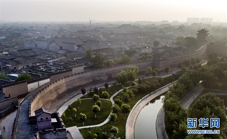 这是7月20日无人机拍摄的平遥古城墙与护城河。平遥古城城墙总周长6163米,墙高约12米,把面积约2.25平方公里的平遥县城隔为两个风格迥异的世界。城墙以内街道、铺面、市楼保留明清形制,城墙以外为新城。