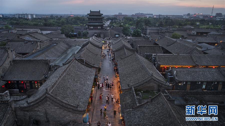 这是7月19日无人机拍摄的夕阳下的平遥古城。