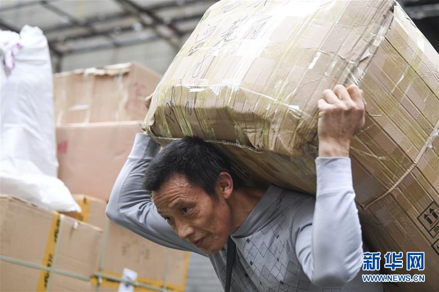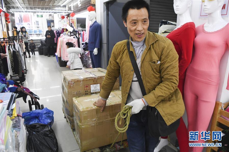 冉光辉在重庆朝天门大正商场内整理即将搬运的货物(1月5日摄)。新华社记者王全超摄