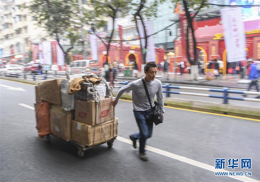 冉光辉用小板车载着货物,从重庆朝天门大生商场出发,前往发货地点(1月5日摄)。新华社记者王全超摄