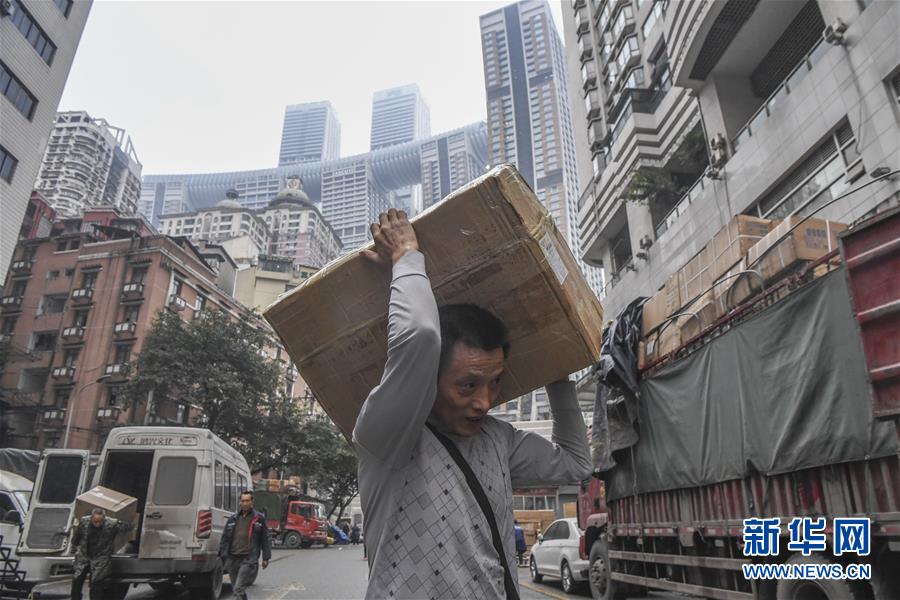 冉光辉在重庆朝天门搬运货物(1月5日摄)。新华社记者王全超摄