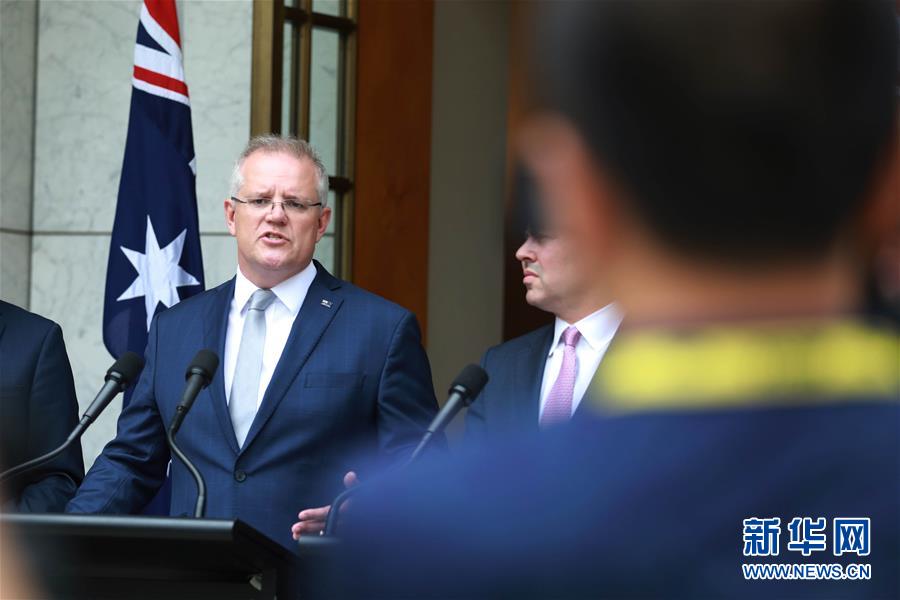 1月6日,在澳大利亚首都堪培拉,澳大利亚总理莫里森(左)在国会大厦出席新闻发布会。新华社记者白旭摄
