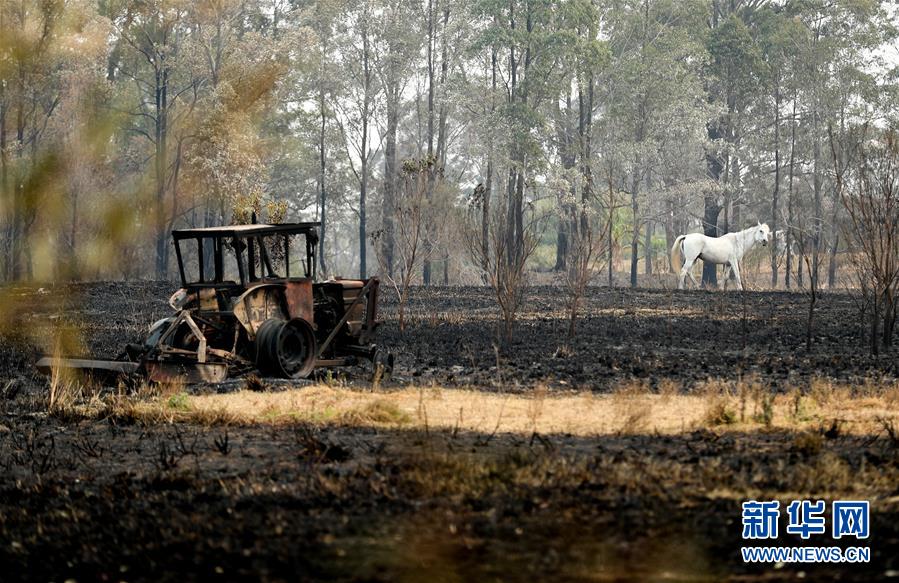 11月11日,在澳大利亚新南威尔士州麦夸里港附近,一匹白马在山火烧过的土地上踱步。新华社记者白雪飞摄