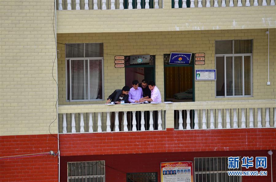 八好村驻村第一书记韦德王(左二)和同事在办公楼里讨论工作(2019年11月12日摄)。新华社记者黄孝邦摄