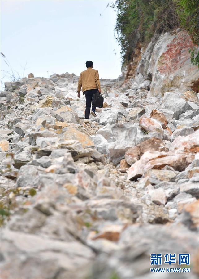 八好村驻村第一书记韦德徒步前往弄麻屯开展扶贫工作,弄麻屯的公路尚在建设当中(2019年12月16日摄)。新华社记者黄孝邦摄