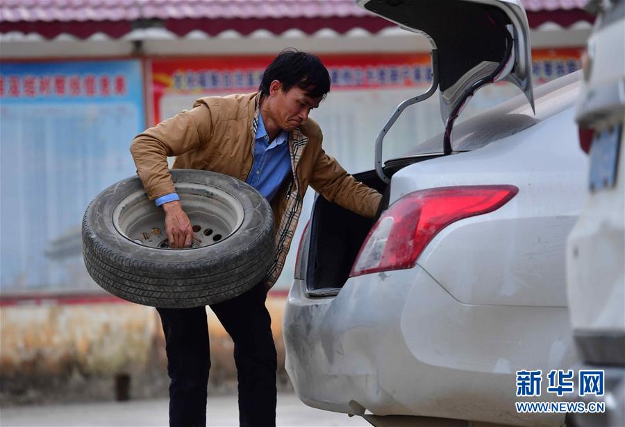 八好村驻村第一书记韦德王将汽车备胎放入后备箱(2019年12月16日摄)。新华社记者黄孝邦摄