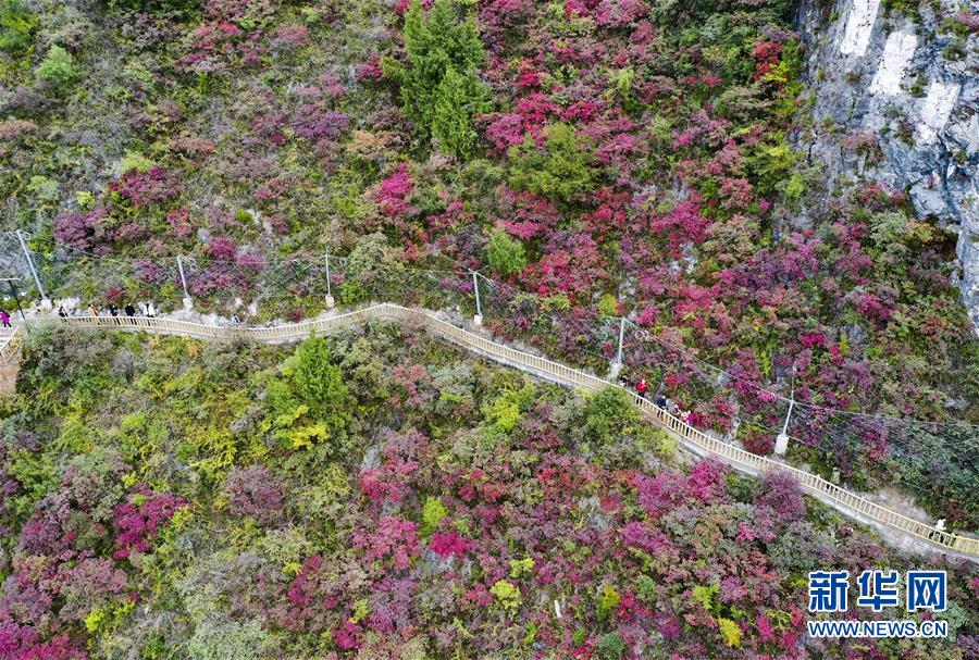 2019年11月23日,游客在位于长江巫峡段的重庆巫山文峰景区游览(无人机照片)。新华社记者王全超摄