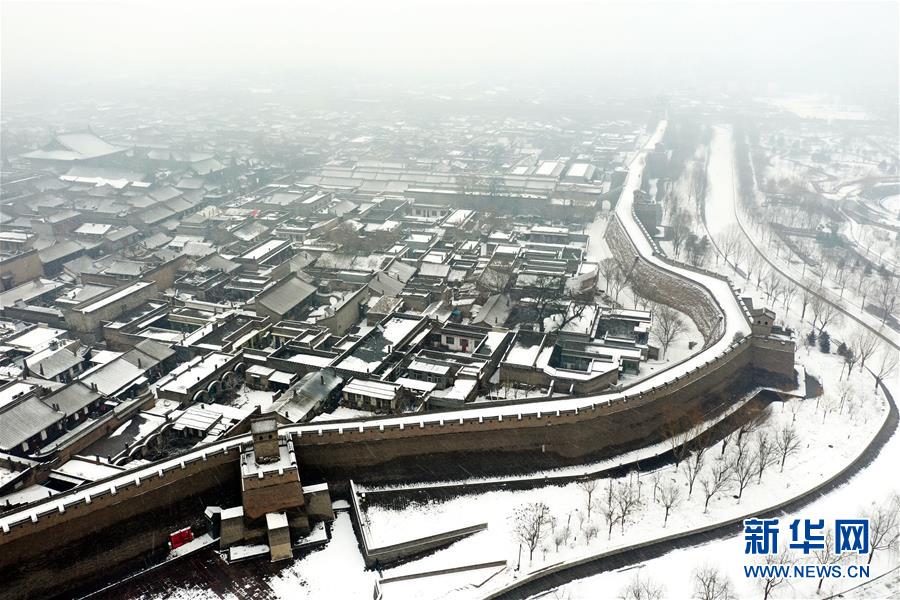 1月5日拍摄的平遥古城城墙与护城河(无人机照片)。新华社记者詹彦摄