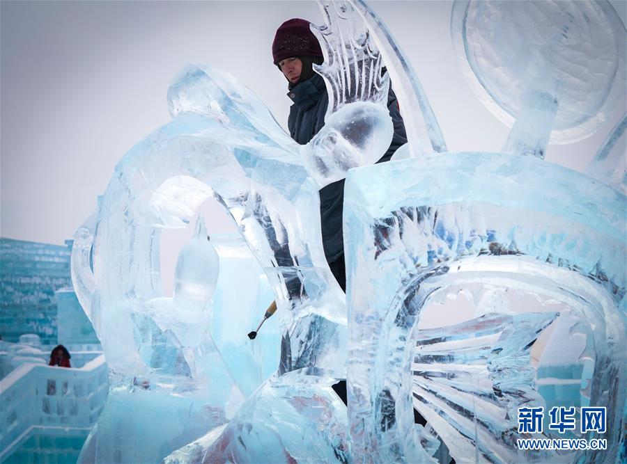 冰雕师在哈尔滨冰雪大世界内雕刻冰雕作品(1月8日摄)。新华社记者王松摄