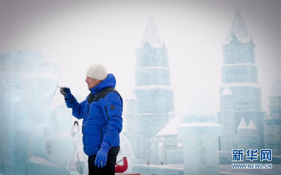 1月7日,参赛者在进行冰雕创作。当日,在哈尔滨冰雪大世界园区举行的第三十四届中国哈尔滨国际冰雕比赛进入第二天,参赛的冰雕作品已芳容初现。新华社记者王松摄