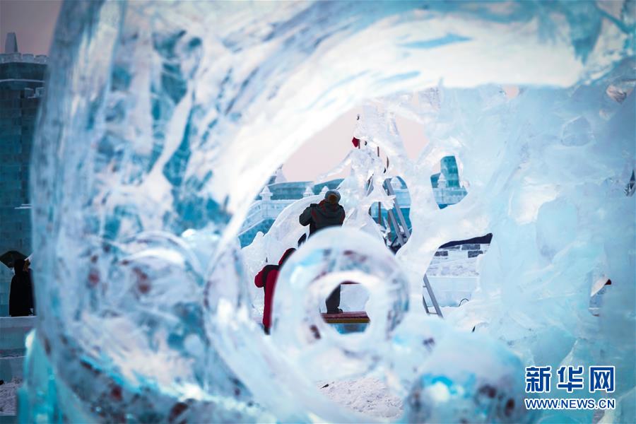 冰雕师在哈尔滨冰雪大世界内雕刻出主题各异的冰雕作品(1月8日摄)。新华社记者王松摄