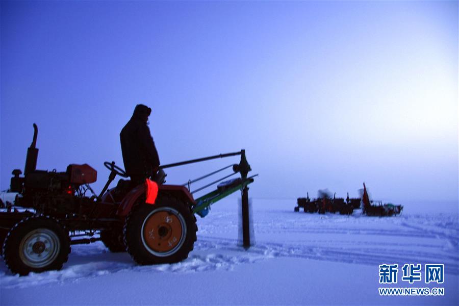 新疆福海县渔民使用冰钻在冰面打眼(1月5日摄)。新华社记者张晓龙摄