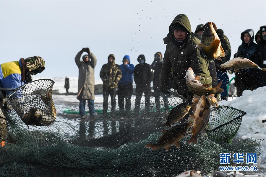 12月18日,工作人员将冬捕鱼打捞上岸。当日,位于内蒙古呼伦贝尔大草原上的诺干湖举行冬捕活动,吸引不少游客前来观看。冬日的诺干湖冰雪覆盖,诺干湖冬捕也是当地冬季旅游的特色活动之一。新华社记者刘磊摄