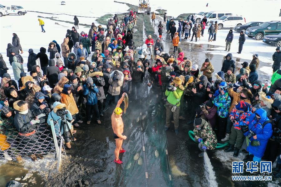 12月18日,一名冬泳爱好者展示冬捕鱼(无人机拍摄)。新华社记者刘磊摄