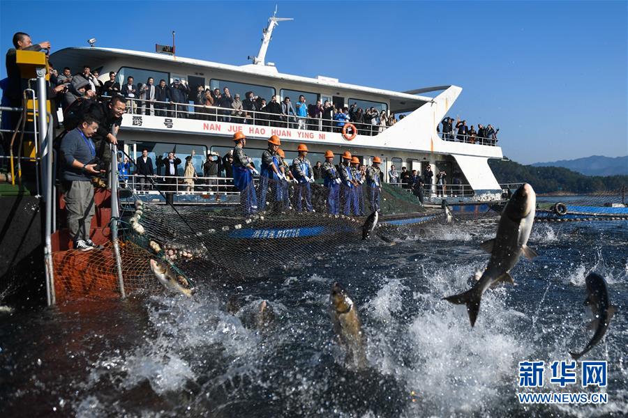 11月28日,游客在千岛湖观看巨网捕鱼。新华社记者黄宗治摄