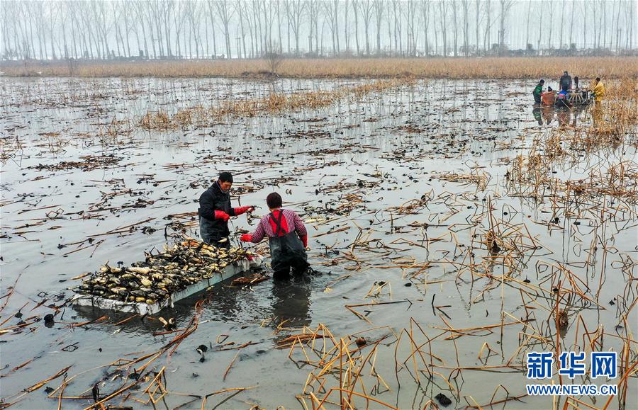 1月10日,村民在磁县禾下土白莲藕立体种养基地采收莲藕(无人机照片)。新华社记者 王晓 摄