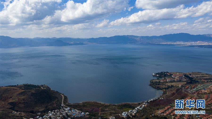 空中俯瞰抚仙湖(无人机照片,1月10日摄)。 来自云南省玉溪市抚仙湖管理局的数据显示,抚仙湖2019年度保持一类水质,总磷、总氮等数值较2018年有所下降。 新华社记者 江文耀 摄