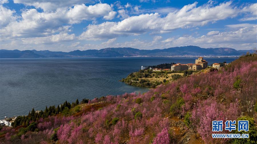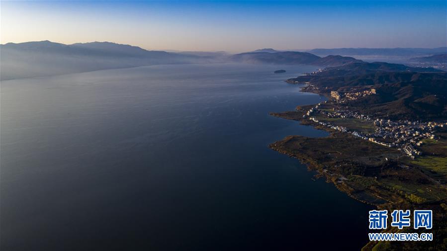 空中俯瞰抚仙湖(无人机照片,1月10日摄)。 来自云南省玉溪市抚仙湖管理局的数据显示,抚仙湖2019年度保持一类水质,总磷、总氮等数值较2018年有所下降。 新华社记者 江文耀 摄