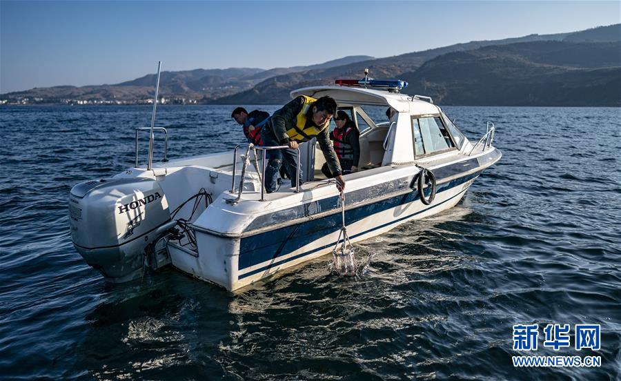 1月10日,云南省生态环境科学研究院的工作人员在抚仙湖取样,进行月度水质监测。 新华社记者 江文耀 摄