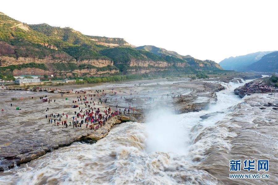 受近日降雨影响,位于山西吉县的壶口瀑布水量增大,壮美的瀑布群景观吸引众多游客前来观赏。新华社记者杨晨光摄