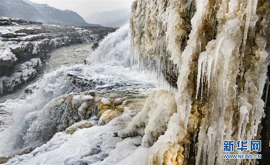1月12日,陕西黄河壶口瀑布景区内的冰瀑与流动的瀑布形成一幅壮丽的图画。新华社记者陶明摄